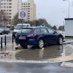 Zderzenie z udziałem samochodu Tramwajów Warszawskich. Po zderzeniu drugie auto ścięło sygnalizator