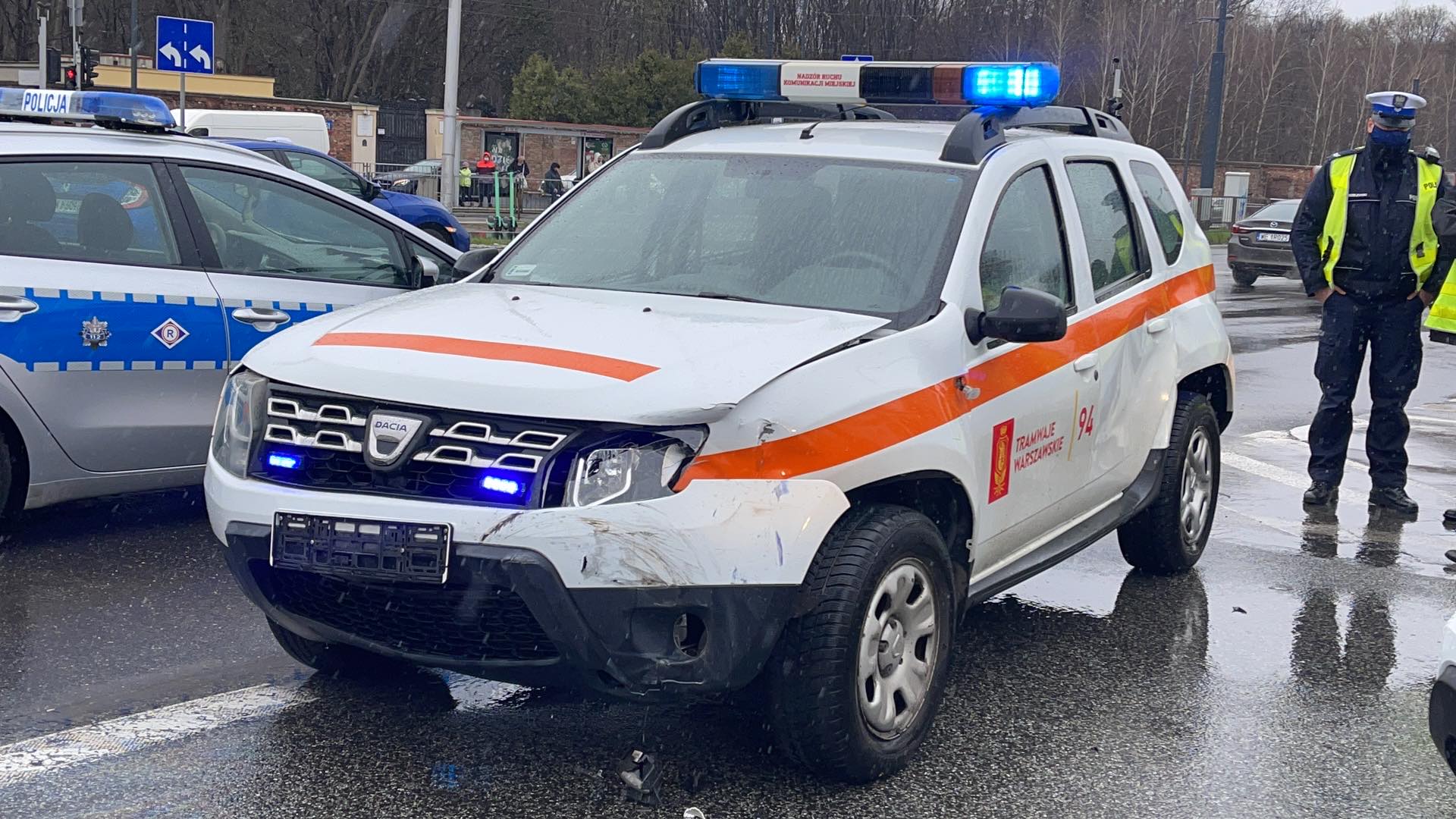 Zderzenie z udziałem samochodu Tramwajów Warszawskich. Po zderzeniu drugie auto ścięło sygnalizator