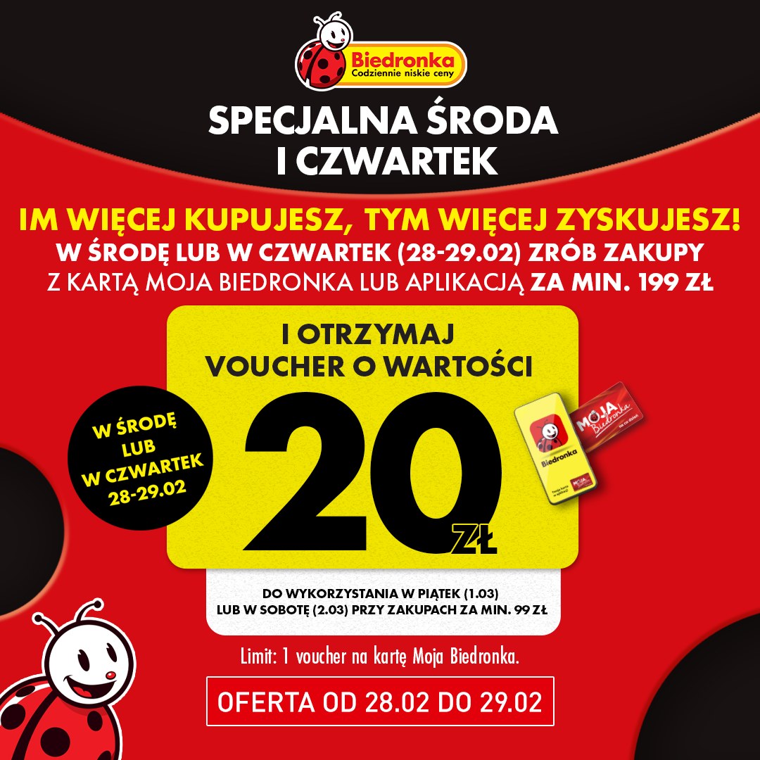 W najbliższą środę i czwartek, a więc 28-29.02, Biedronka zaprasza do skorzystania z wyjątkowej oferty. Wystarczy, że zrobisz zakupy na kwotę minimum 199 zł, by otrzymać voucher o wartości 20 zł. Jest to świetna okazja, aby zaoszczędzić na codziennych wydatkach lub pozwolić sobie na drobne ekstra zakupy.