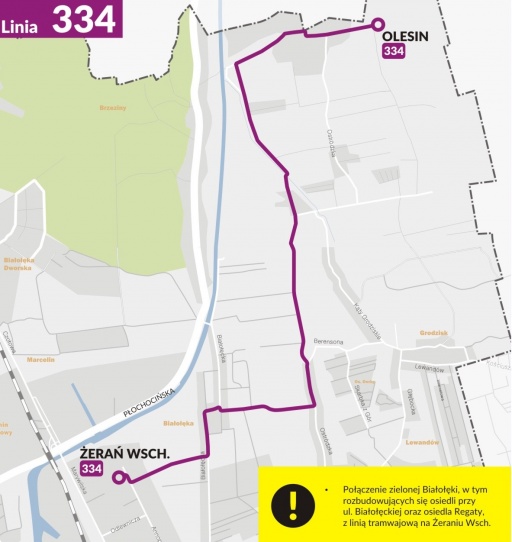 Linia zgodnie z postulatami mieszkańców Białołęki pozwoli na połączenie zielonej Białołęki, w tym rozbudowujących się osiedli przy ul. Białołęckiej oraz osiedla Regaty, z linią tramwajową na Żeraniu Wschodnim. Autobusy 334 kursować będą wyłącznie w dni powszednie.