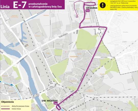 Propozycja zakładała skierowanie linii do nowej pętli w rejonie Grodziska oraz dwukierunkowe kursowanie ulicą Skarbka z Gór pomiędzy ul. Berensona a ul. Jesiennych Liści. W toku konsultacji napłynęło do ZTM wiele wniosków od pasażerów z os. Derby o wprowadzenie takiej zmiany. Jednocześnie trafiło do ZTM wiele postulatów przede wszystkim od mieszkańców rejonu ul. Głębockiej o pozostawienie tej linii na obecnej trasie. W związku z powyższym planujemy skierować linię 527 tak jak w projekcie z pominięciem ulicy Głębockiej, a dla grupy pasażerów z rejonu tej ulicy uruchomić oddzielną linię przyspieszoną – całotygodniową, powstałą z przekształcenia obecnej linii E-7, która kursować będzie na trasie DW. WILEŃSKI – GRODZISK w obu kierunkach przez ul. Głębocką. W zamian za wycofanie linii E-7 z ul. Skarbka z Gór zwiększona zostanie częstotliwość kursowania linii 527 w godzinach szczytu – do 5 minut w porannym i do 7,5 minuty w popołudniowym szczycie. Szczegółowa trasa: