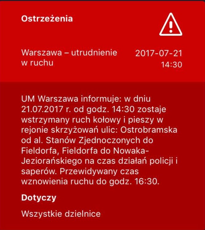 „Po godzinie 11:00 otrzymaliśmy informację o znalezieniu pocisku. Na miejsce udał się patrol saperski z Kazunia. Ewakuowano dwie stacje benzynowe, pobliskie centrum handlowe, a także mieszkańców 10 budynków na ulicy Łukiskiej, Filomatów, Perkuna i Fieldorfa.”- mówi Ewa Sitkiewicz z biura prasowego Komendy Stołecznej policji w rozmowie z Warszawą w Pigułce