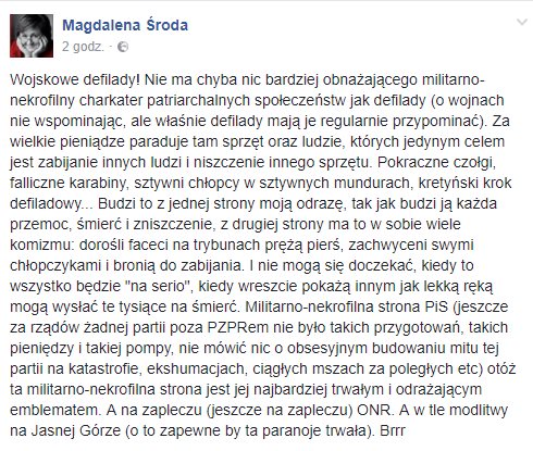 Magdalena Środa, znana warszawska psycholog i feministka uważa defiladę za niepotrzebną, dodała też, że „nie ma chyba nic bardziej obnażającego militarno-nekrofilny charkater patriarchalnych społeczeństw jak defilady”.