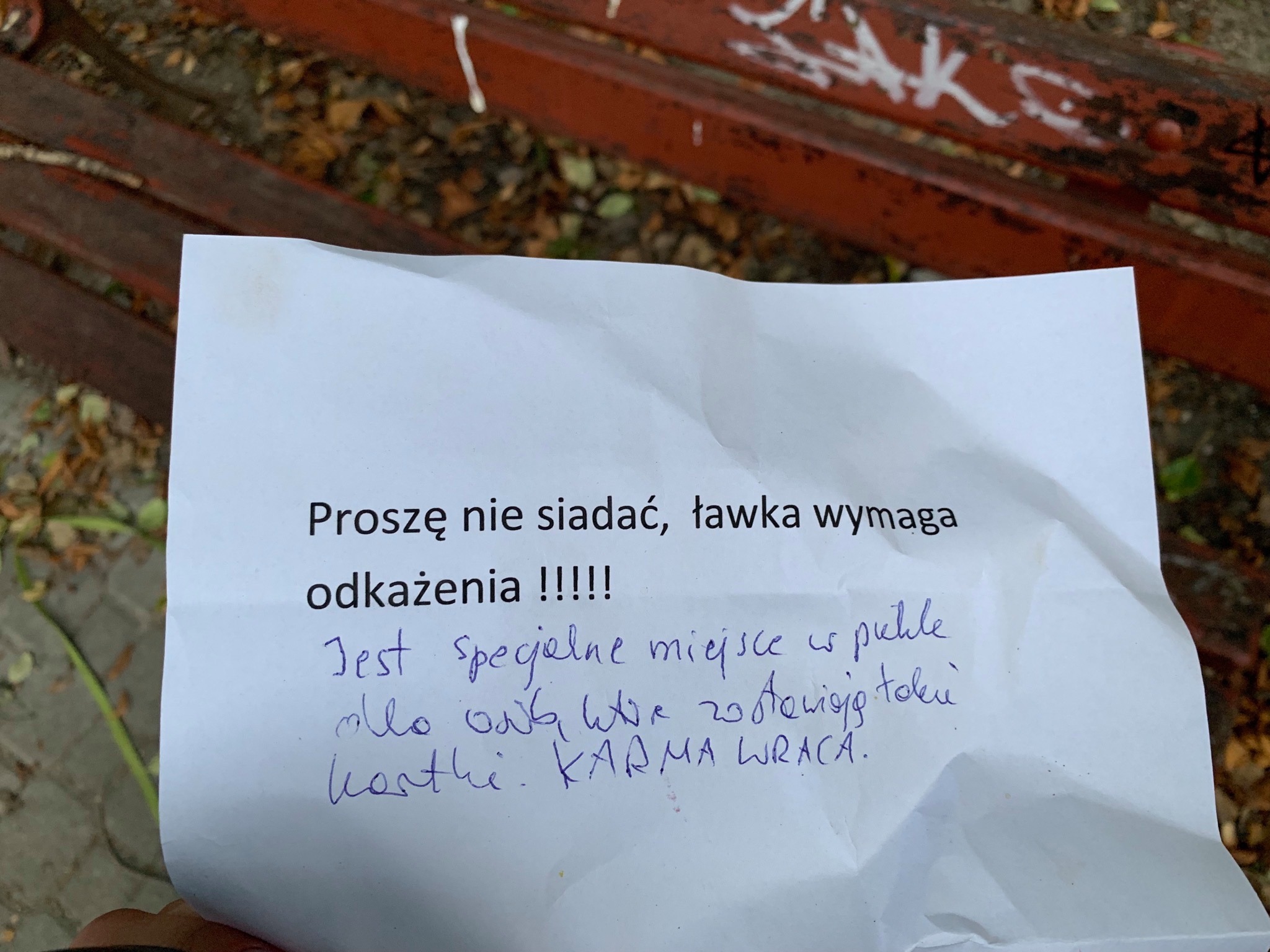 „Ludzie, błagam, bezdomność to złożony problem, zamiast zostawiać takie kartki, spróbujcie w jakikolwiek sposób pomóc. Dla kogo zostawiłeś człowieku te kartkę? Kto to ma odkazić? Twoim ulubionym zajęciem jest wyśmiewanie i obrażanie bezdomnych? Ostatnio sporo tutaj postów o „pijaczkach z Placu Narutowicza”. Nie róbmy z bezdomych ucieleśnienia zła, przestańmy ich ciągle obrażać. Osoby bezdomne są w pełni świadomo swojej beznadziejnej sytuacji, przypominanie im o naszej nienawiści i niechęci do nich tylko pogarsza sprawę i na pewno nie pomoże wyjść z bezdomności. Dziękuję osobie, która skomentowała przekaz tej kartki. Pozwoliłam sobie wyrzucić to paskudztwo”– pisze Pani Julianna.
