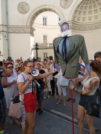 Na proteście przeciwko pandemii pojawiła się kukła ministra zdrowia Łukasza Szumowskiego. Uczestnicy symbolicznie rzucali maski na kukłę.
