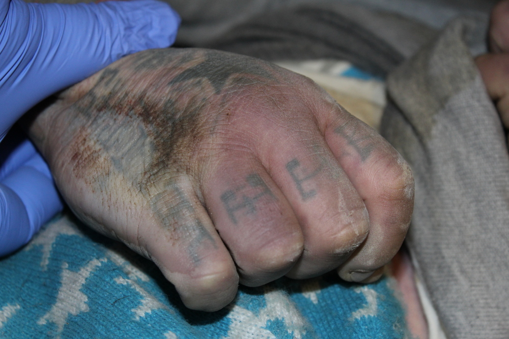 Znaki szczególne: na prawej ręce tatuaże: na palcach litery lub znaki; na zewnętrznej części dłoni ,,gwiazdki” około pięciu różnej wielkości, obok nich litery … KITAS; na przedramieniu tatuaż ,,DEVIL” oraz tatuaż w kształcie tzw. tribula; na lewej piersi tatuaż w kształcie herbu obejmujący lewy sutek; na szyi po prawej stronie pod prawym uchem tatuaż skorpiona; na brzuchu nad pępkiem tatuaż typu gwiazda pięcioramienna.