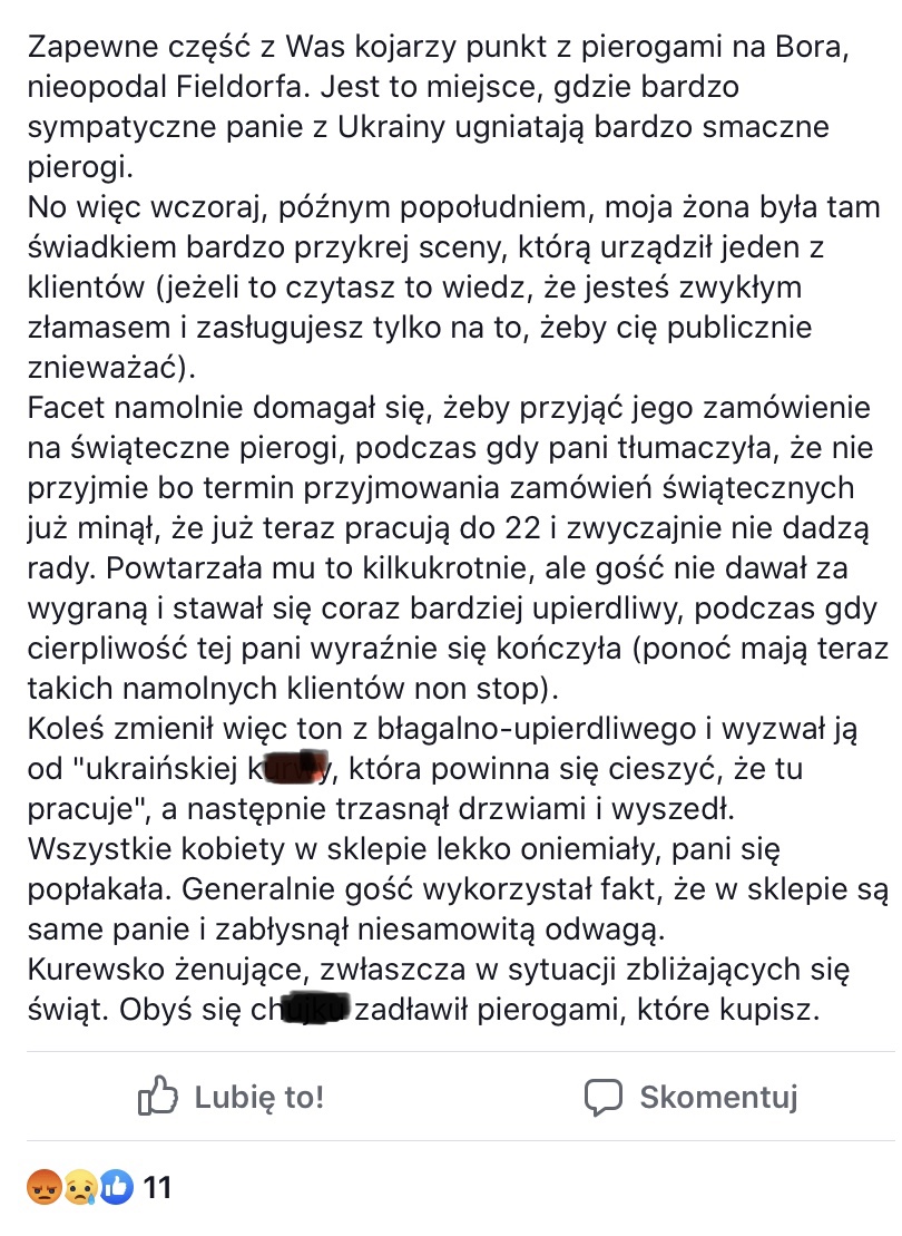 Kurewsko żenujące, zwłaszcza w sytuacji zbliżających się świąt. Obyś się ch**ku zadławił pierogami, które kupisz.” – kwituje Pan Wiesław.